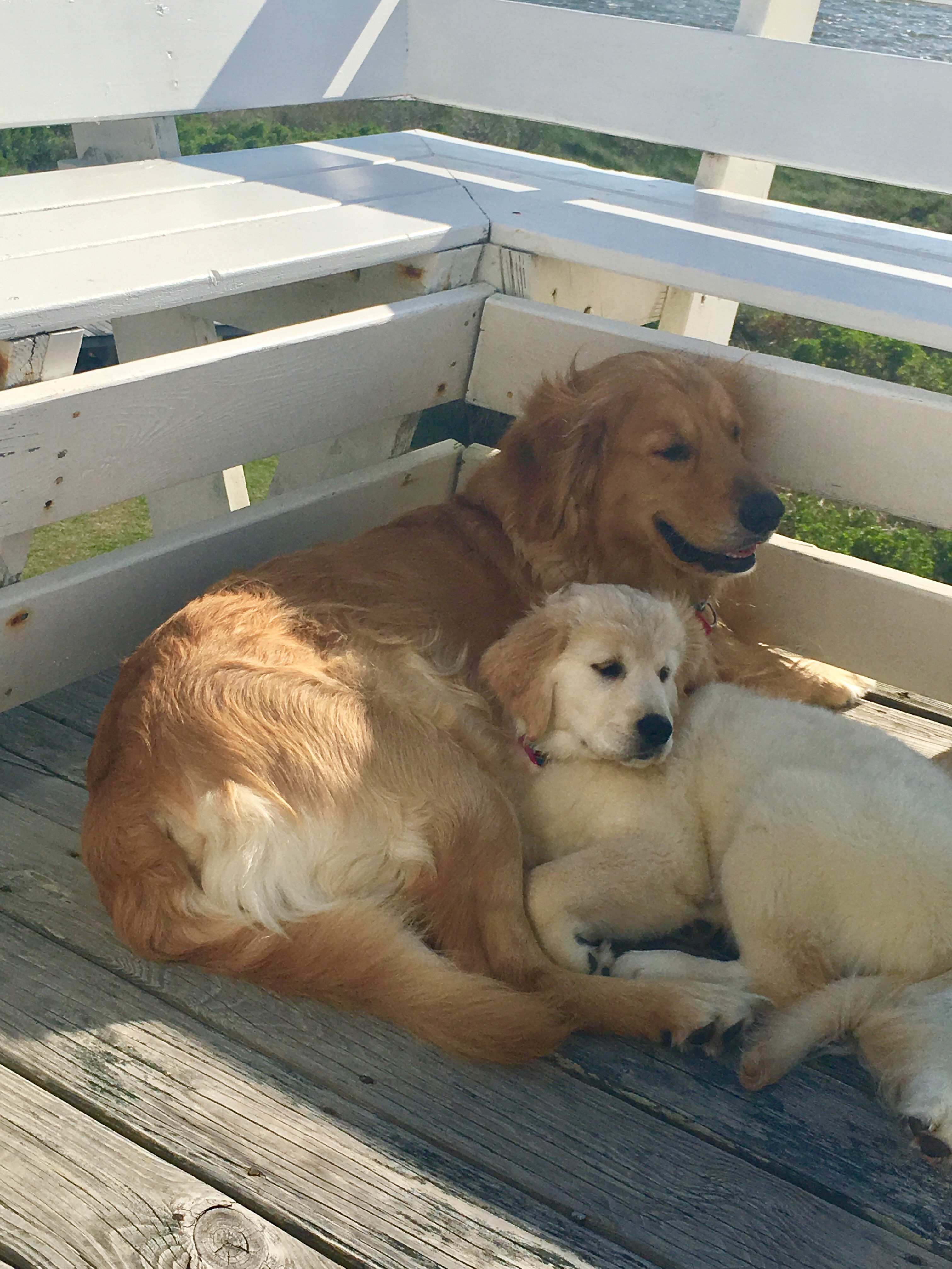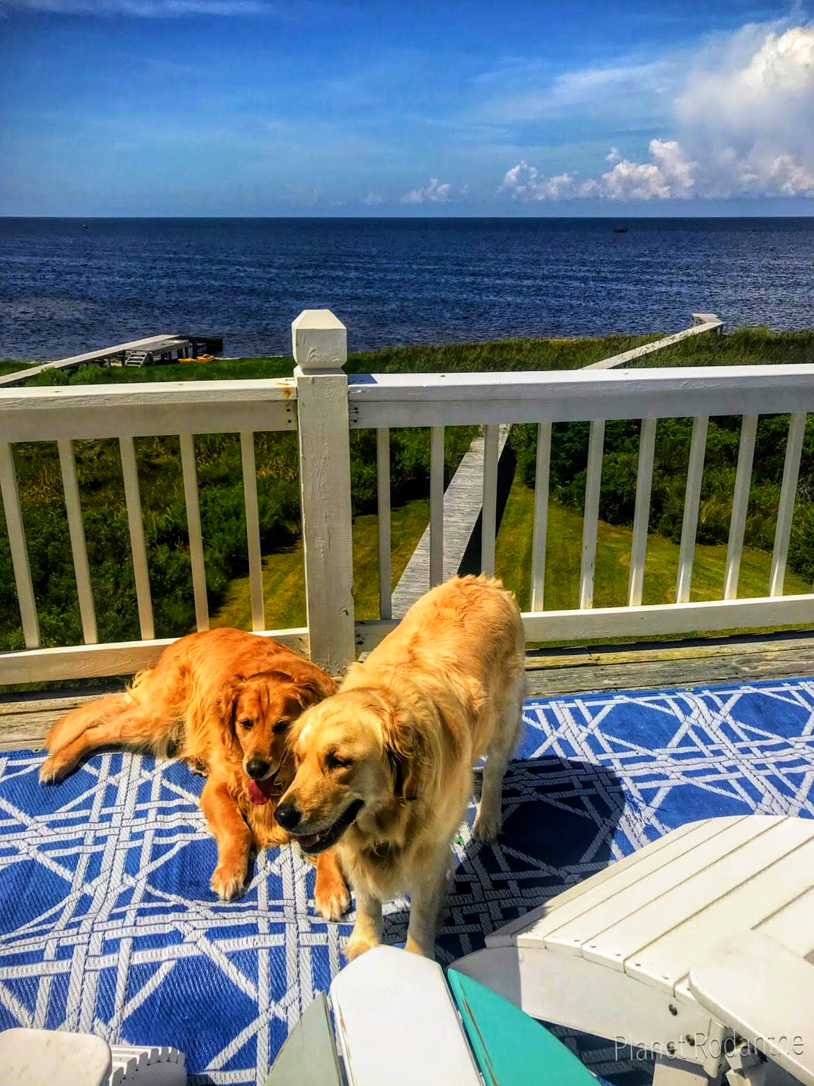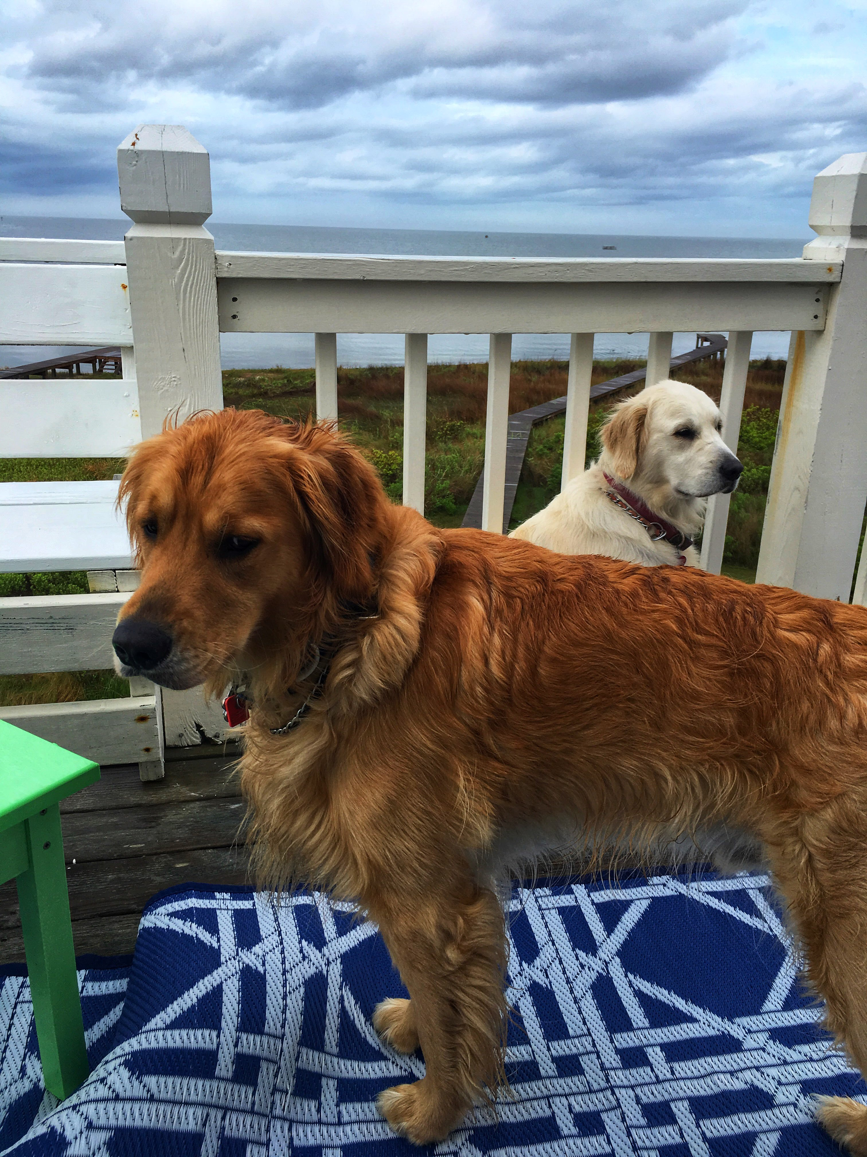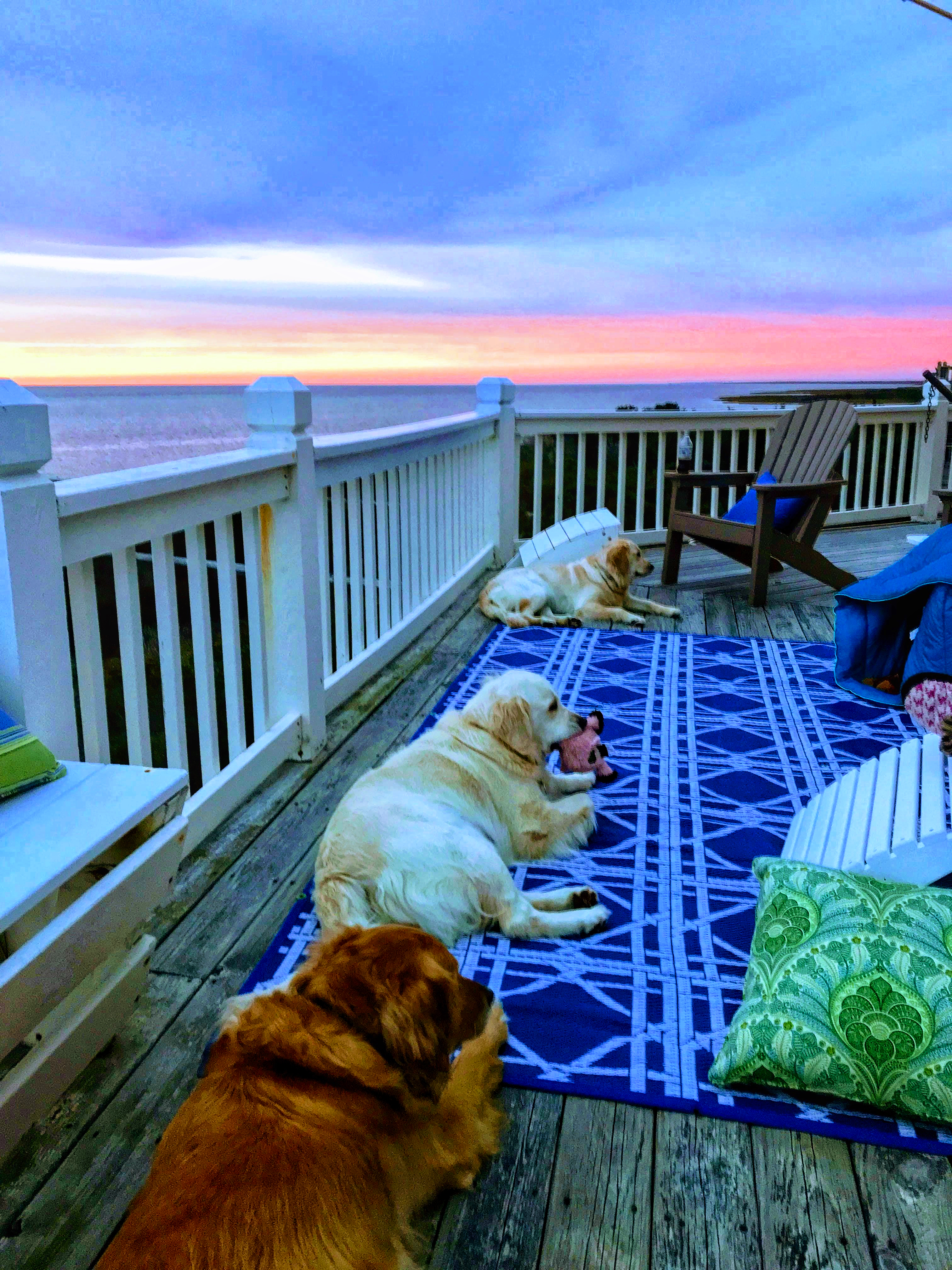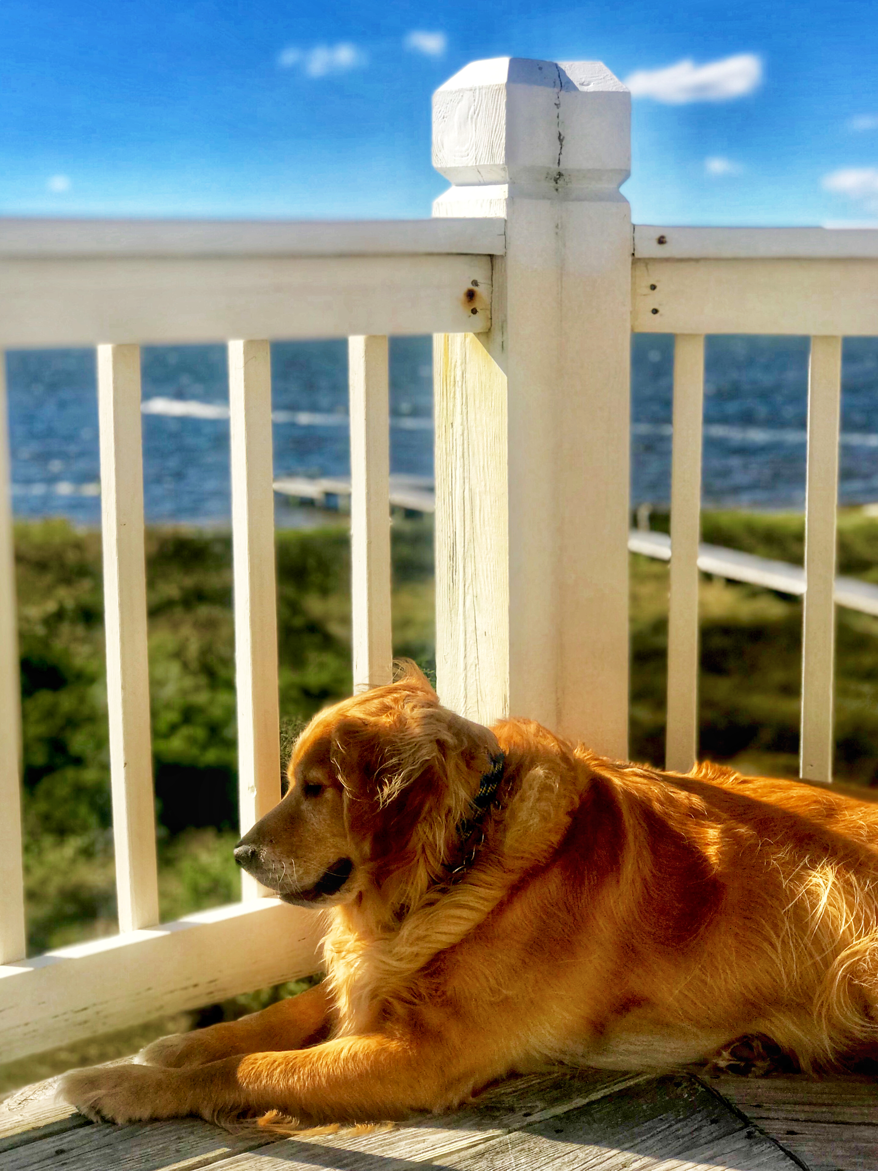 The Sound Side Golden Retrievers spend a lot of time laying around on the deck of the house. The go there after they are hosed down after a swim in the Ocean or Sound. They tend to end up there a lot due to their tendency to always head to the Sound whenever they can.